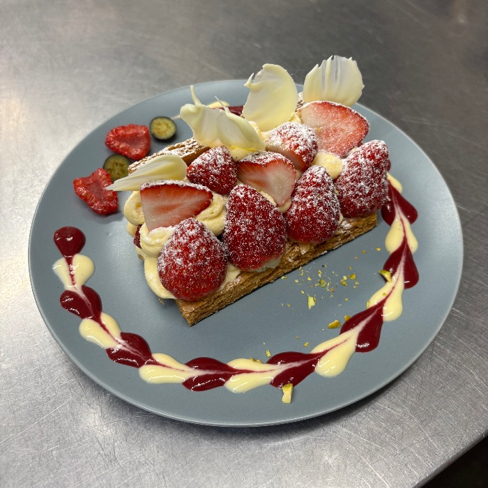 2025.11.05 苺のミルフィーユ🍓 今年も苺のミルフィーユが始まりました!🍓 冬苺とサクサクのパイ、カスタードクリームの相性が抜群です😆 セットでジェラートも付いてきます🍨 12月初旬までの販売になります。 ご来店お待ちしております☺️