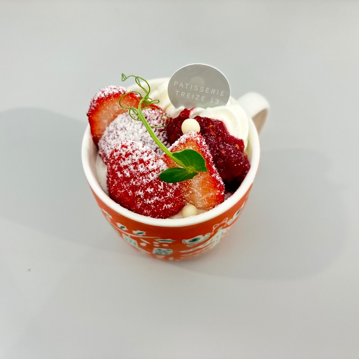シロップをたっぷりうったスポンジにレアチーズクリーム、3種類のベリーのコンフイチュール、いちごを飾ったケーキです。